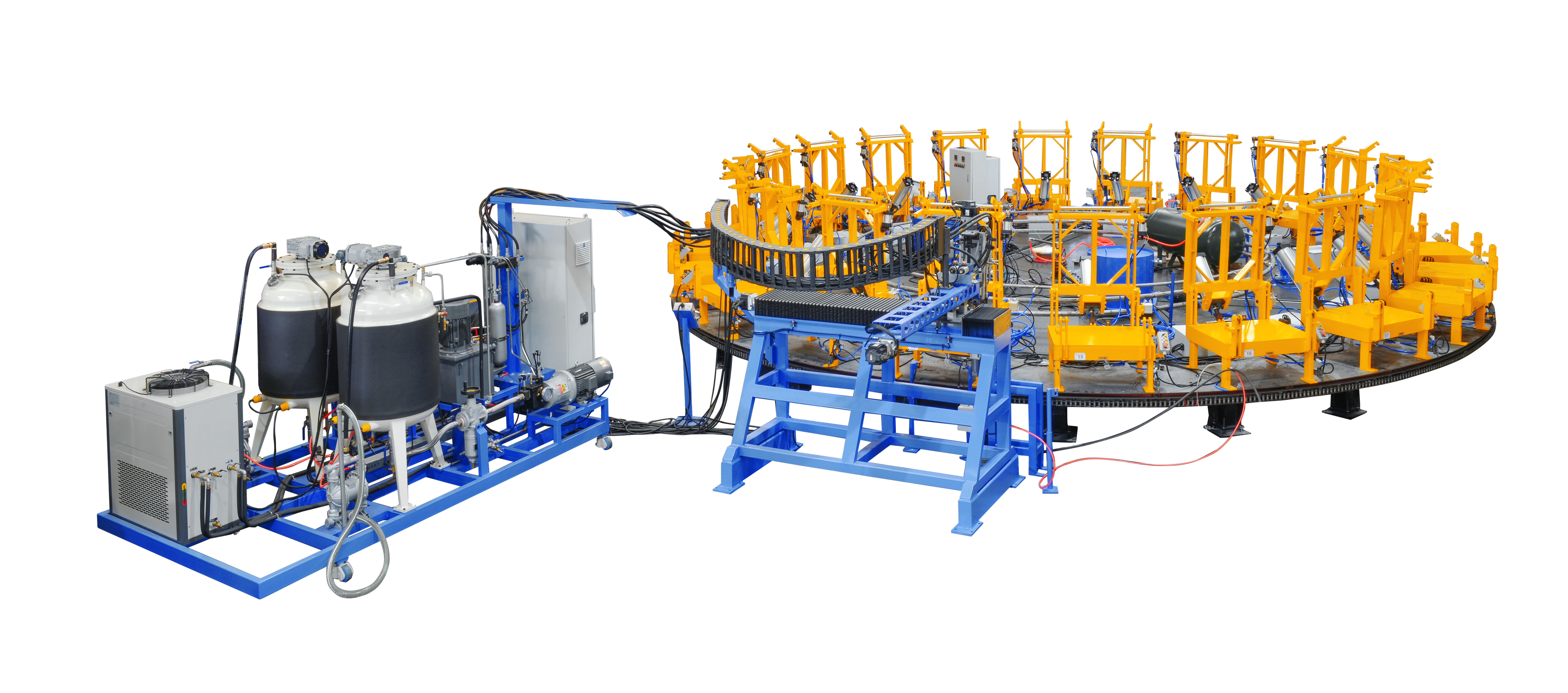 全自動圓盤生產(chǎn)線與模架、聚氨酯高/低壓發(fā)泡機(jī)、模溫機(jī)配套使用形成一條完整的發(fā)泡生產(chǎn)線。 是一種多用途的模具傳送線,適合用于少品種多數(shù)量的大批生產(chǎn),如汽車、摩托車座椅、汽車內(nèi)飾件等各種聚氨酯制品的發(fā)泡。