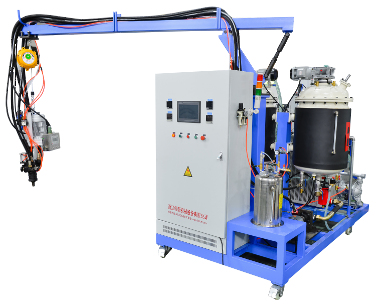 低壓發(fā)泡機(jī)是A料多元醇與B料異氰酸酯兩組原料分別儲(chǔ)存在兩個(gè)儲(chǔ)料罐中,通過(guò)兩臺(tái)高精度齒輪計(jì)量泵送至混合槍頭,經(jīng)過(guò)攪拌葉高速攪拌而達(dá)到均勻的混合效果,注入模具中生產(chǎn)所需要的制品。